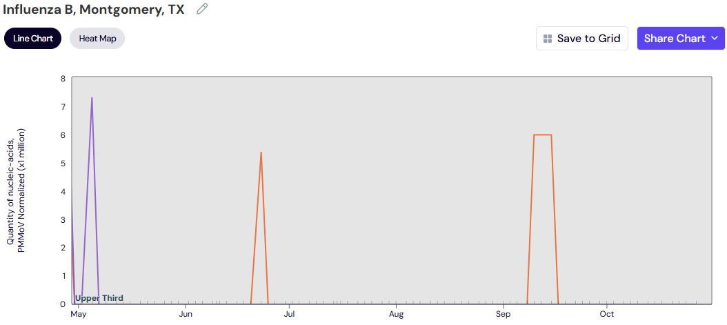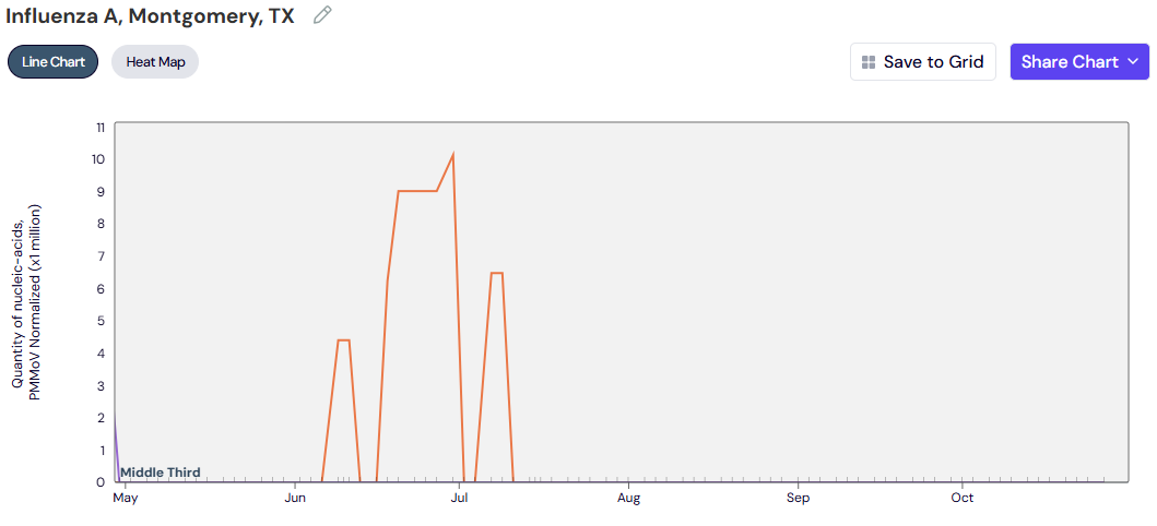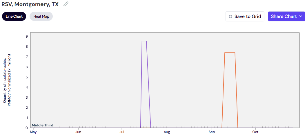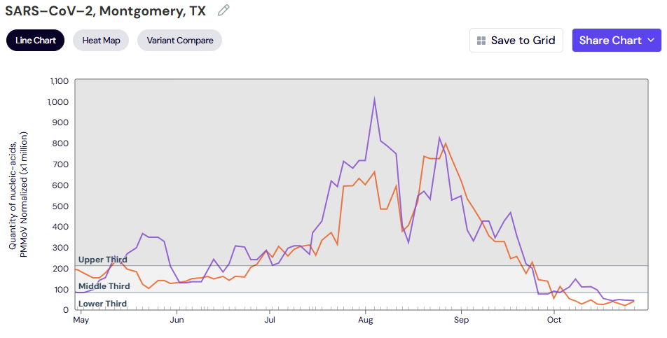 The Epidemiology Division is monitoring respiratory illnesses through wastewater data from the WastewaterSCAN dashboard. WastewasterSCAN is a program based at Stanford University that utilizes wastewater-based epidemiology to monitor infectious diseases through municipal wastewater systems. The program collects, processes, and analyzes wastewater solids collected from municipal wastewater plants across the United States, including 2 plants located in Montgomery County. Both wastewater plants are located in The Woodlands.